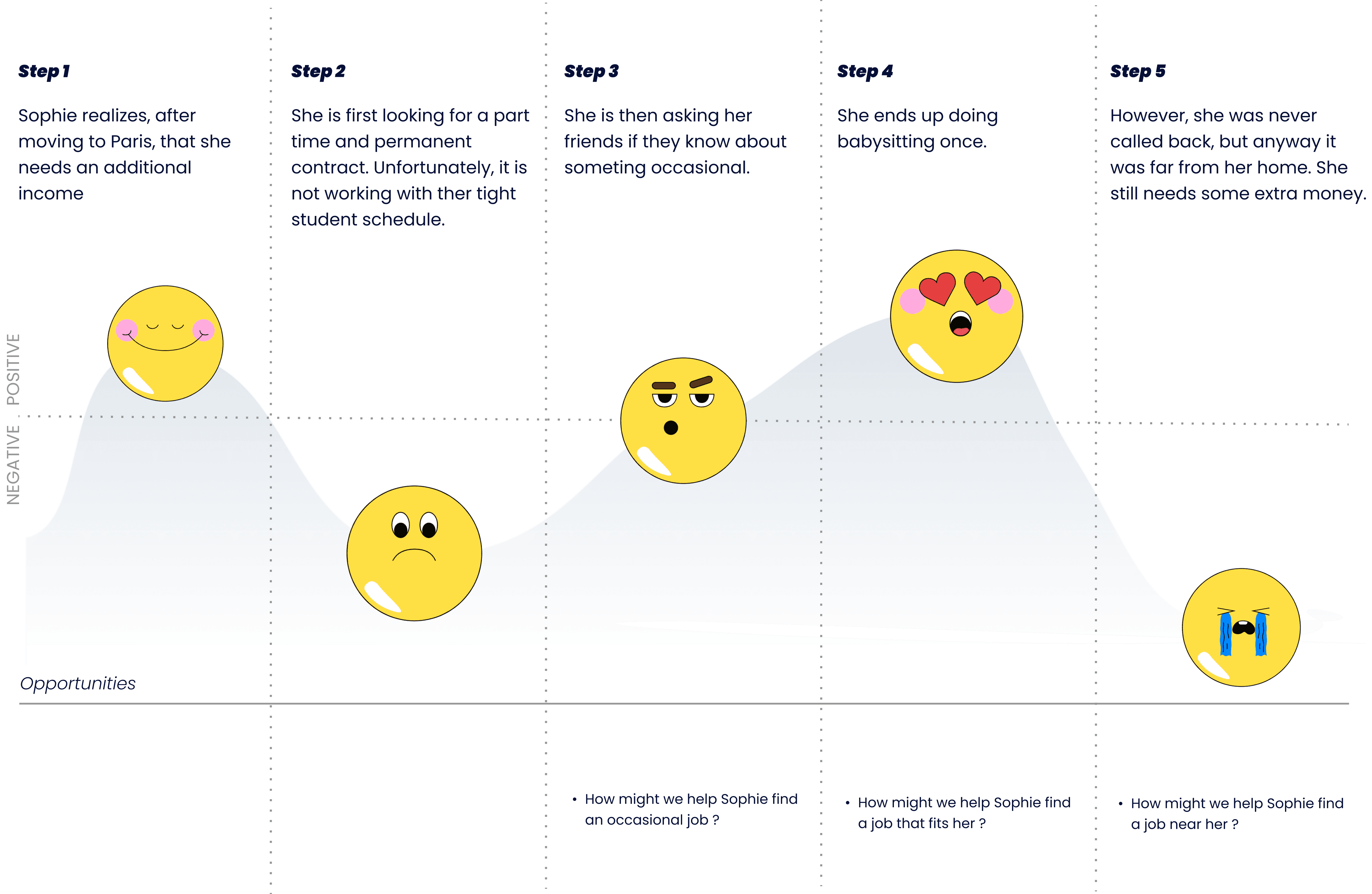 To understand the obstacles Shopie could face while finding a job that fits her, we define a user journey map from which we could ask ourself how might we help her in the different points of this journey.