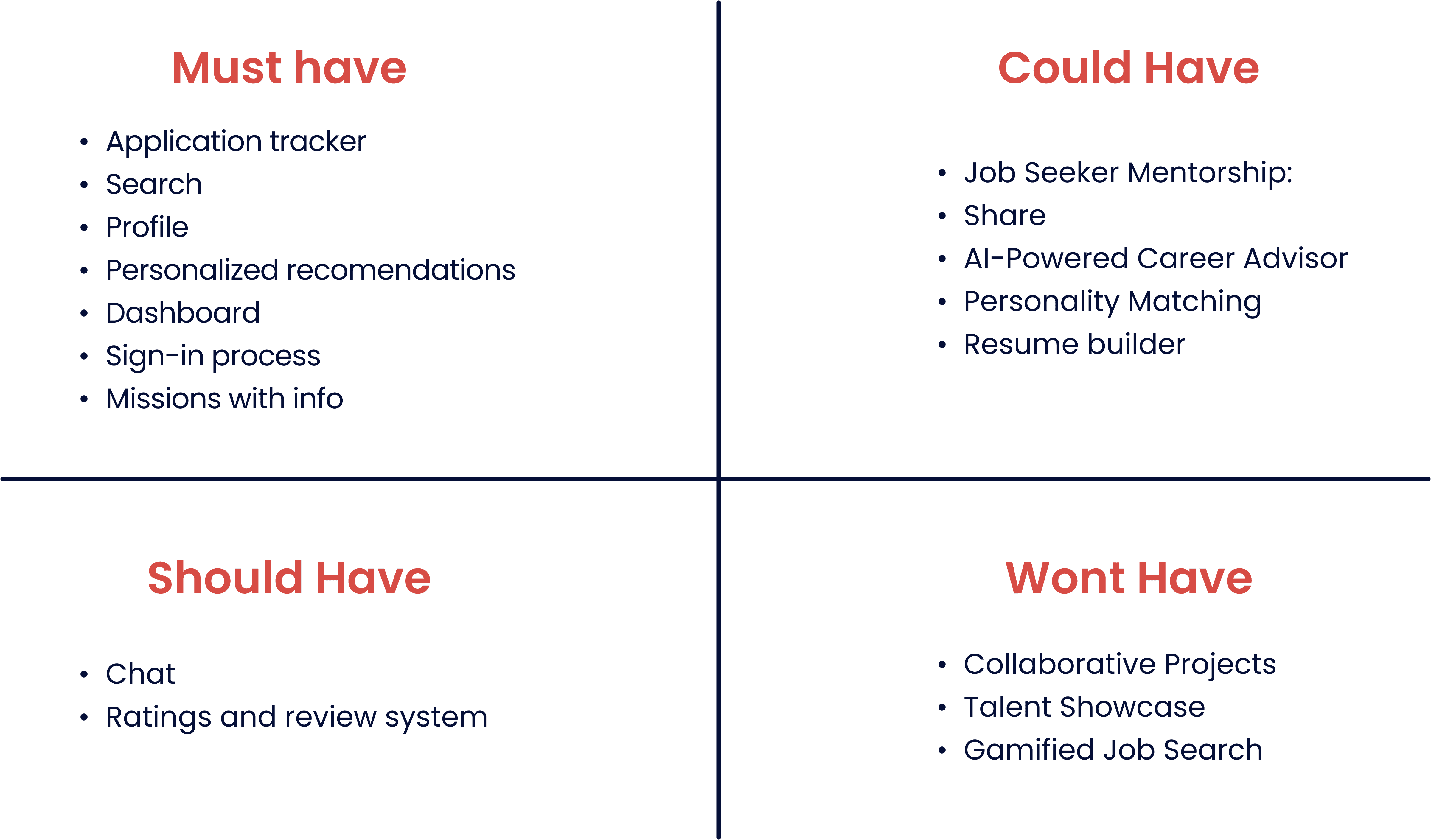 Using the knowledge gained from our empathize phase, we dove into ideation with an array of creative brainstorming sessions applying the MoSCoW method to prioritize our ideas based on their feasibility and impact.