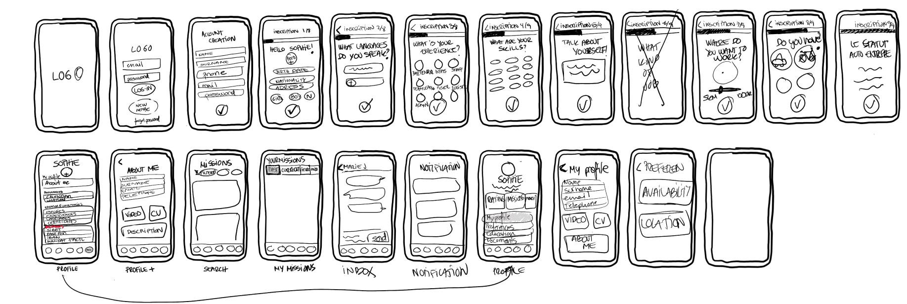 Early sketches explored different ways to organize job listings and simplify navigation.
